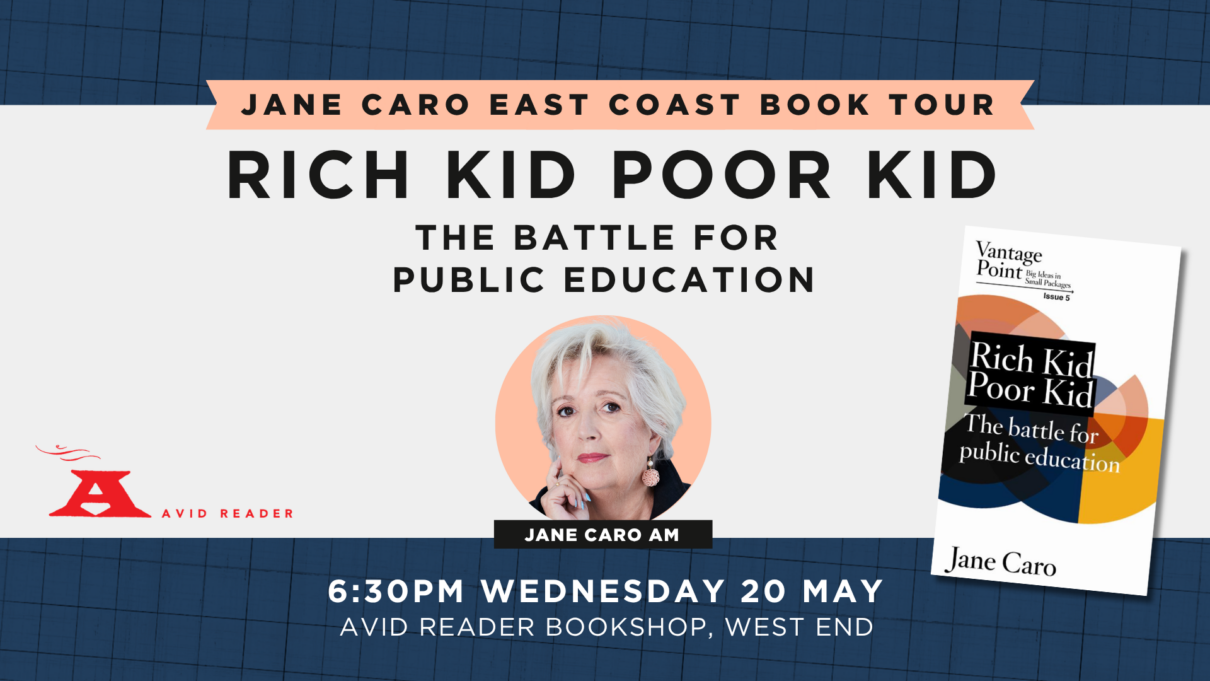 QLD 1 month to start Jane Caro Rich Kid Poor Kid East Coast Book Tour Jane Caro – Rich Kid Poor Kid Wed, May 20, 2026 6:30 pm AEST Avid Reader Bookshop Book tickets now
