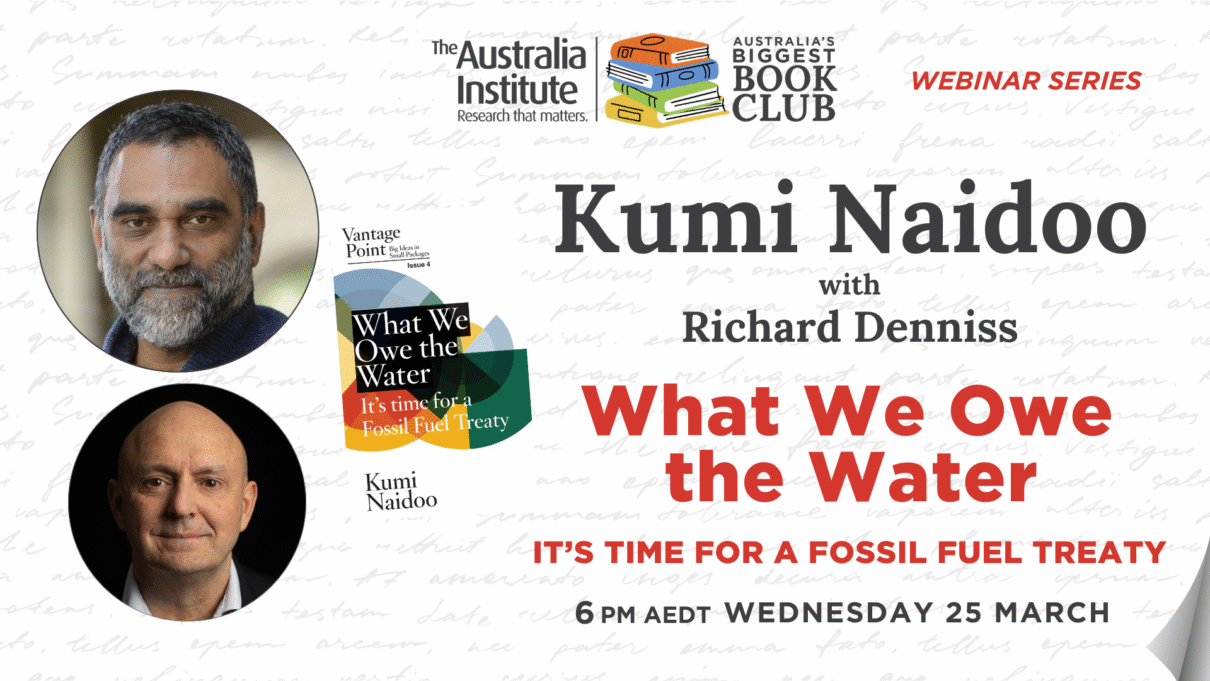 Join Kumi Naidoo in conversation with Dr Richard Denniss as they discuss Kumi’s new essay, What We Owe the Water: It’s Time for a Fossil Fuel Treaty. From the flood-soaked streets of Lismore to the rising waters in the Pacific, the effects of climate change are here. Australia stands at a profound crossroads. It can