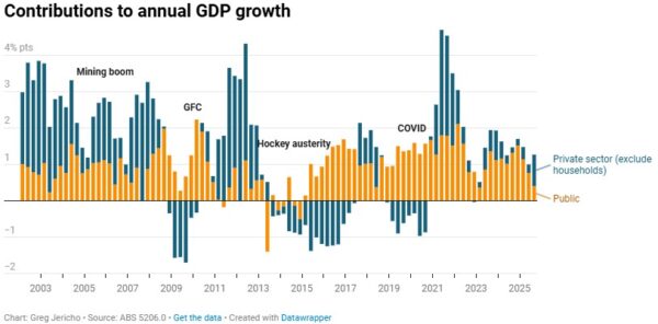 During the mining boom, the private sector contributed more to economic growth than the public sector, but in the GFC that was reversed. Then Joe Hockey tried austerity even though the private sector was struggling.