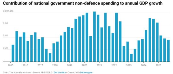 The opposition’s line also seems rather silly given just after Ms Bullock’s appearance before the committee the GDP figures were released showing that the contribution of non-defence spending by the federal government over the past year had fallen again, and was around levels observed during 2015-16 and lower than that of 2018 and 2019.